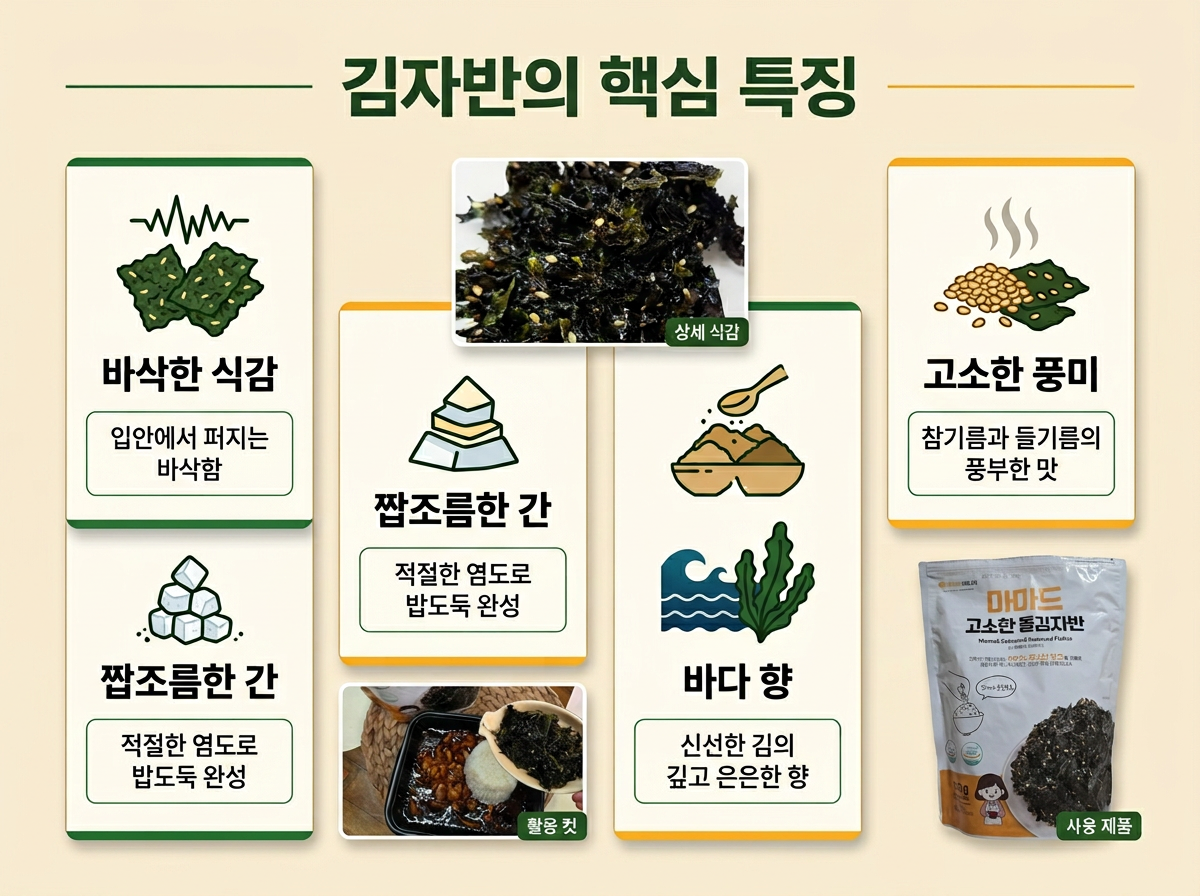 | 김자반 | 굵은 조각 형태 | 바삭·씹힘 강함 | 밥반찬·덮밥 고명 |