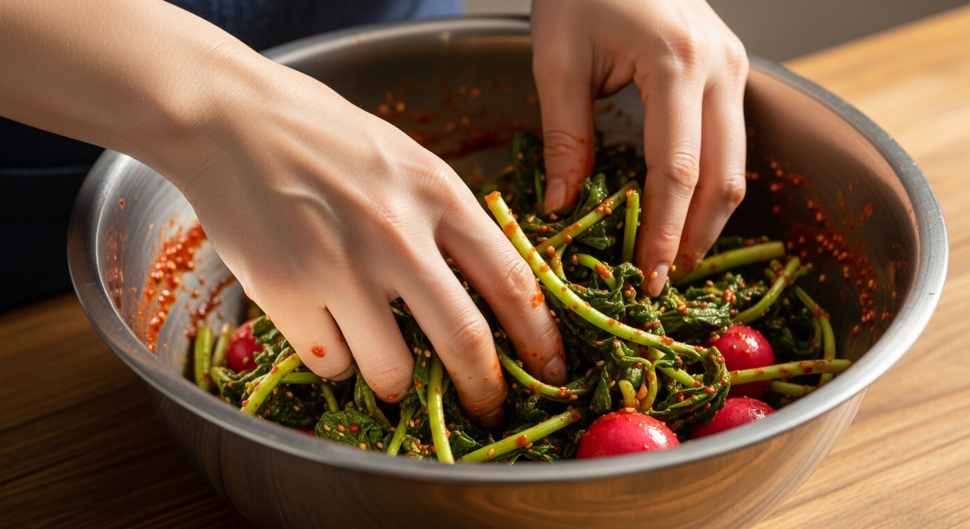열무김치의 아삭함은 사실 절이는 과정에서 결정됩니다. 열무가 소금물에 절여지면서 수분이 빠져나갈 때, 열무 조직이 손상되는 것을 막고 단단하게 유지하는 것이 중요합니다.