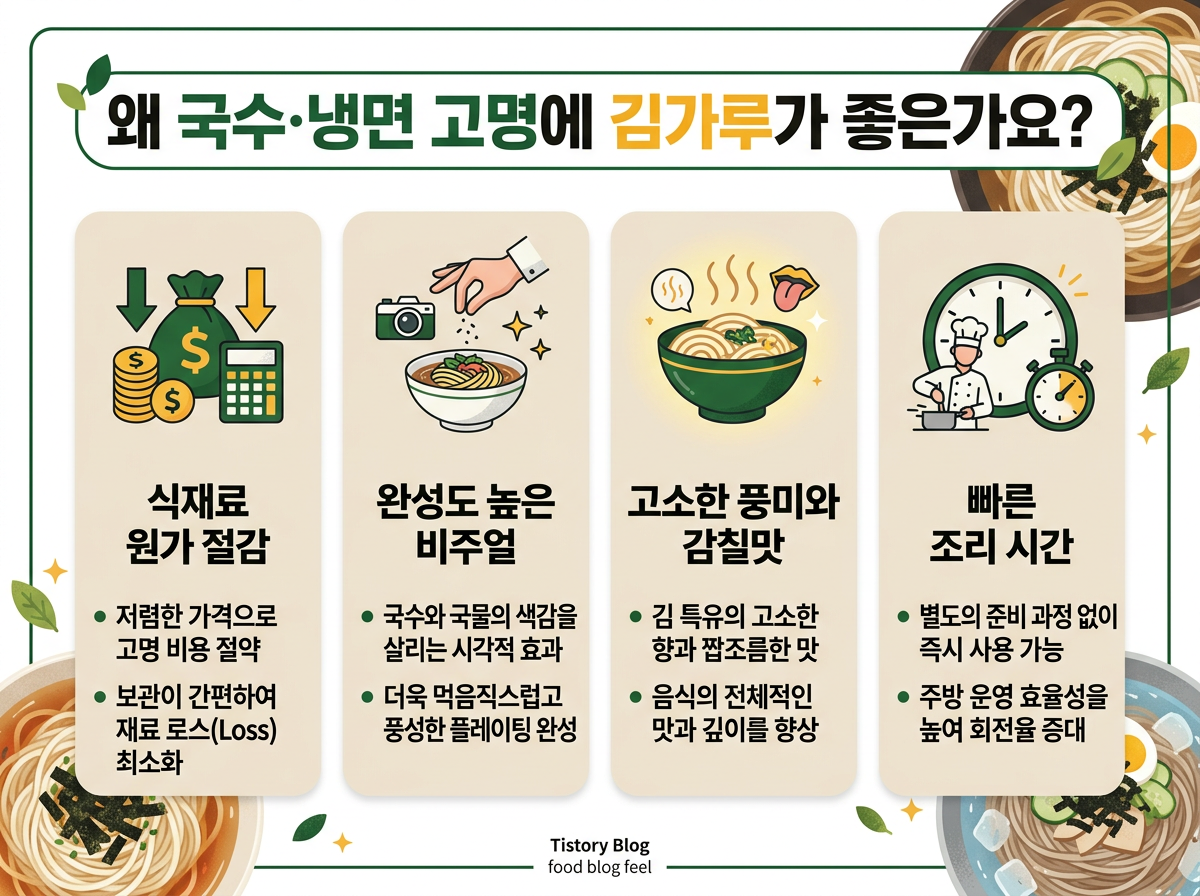 | 김가루 고명 | 약 30~60원 | 0분 (바로 사용) | 색감·풍미·비주얼 |